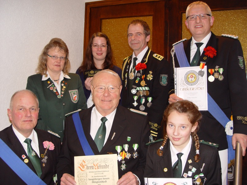 Die Geehrten: (hinten v. l.) Claudia Hüls (Schützenkreis), Marleen Riepe und Detlev Goldbecker (Ehemalige Majestäten) sowie Oberst Volker Schreiber, (vorne v. l.) Vorsitzender Uwe Deppe, Ehrenmitglied August Klei und Jana-Marie Duckert (ehemalige Jugendkönigin).