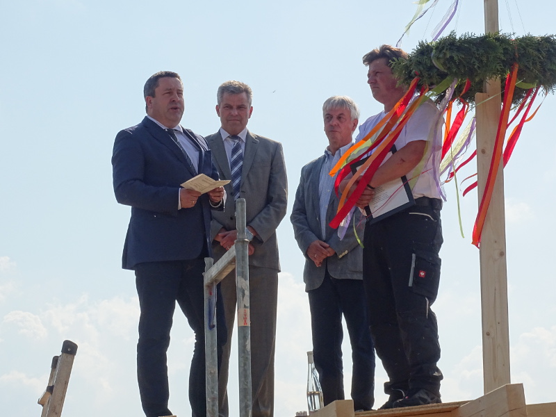 Oerlinghausen. Es geht voran: Nachdem am 05. Februar diesen Jahres der Spatenstich für den Bau der Rettungswache stattfand, konnte nun bereits nach einer dreimonatigen Bauphase Richtfest in Oerlinghausen gefeiert werden. Direkt neben der Feuerwache an der Robert-Hanning-Straße gelegen, wurde der Bau der Wache mit regionalen Unternehmen realisiert, für deren Arbeit Landrat Dr. Axel Lehmann beim Richtfest lobende Worte fand: „Es hat sich ausgezahlt, beim Bau der Rettungswache auf Firmen aus der Region gesetzt zu haben. Dank ihrem vollen Einsatz haben sie ihren Teil dazu beigetragen, diese wichtige interkommunale Kooperation voranzubringen.“