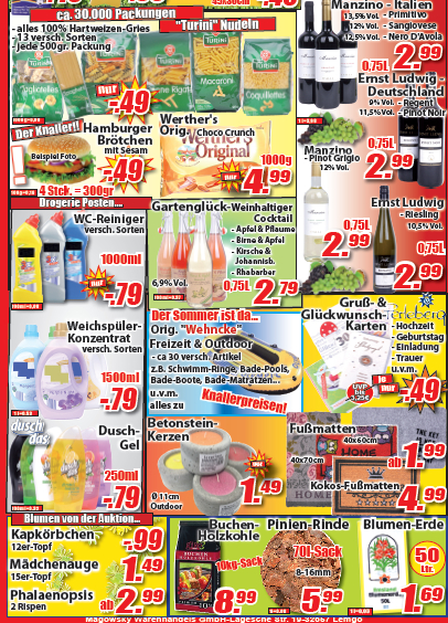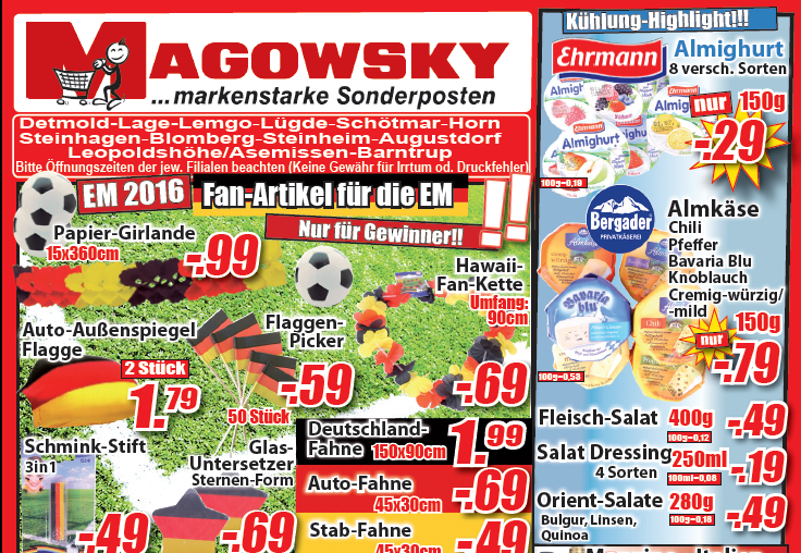 WERBEANZEIGE. In dieser Woche hat Magowsky genau das Richtige für alle Fans der Nationalelf. Diverse Fanartikel von Papiergirlanden über Autoaußenspiegelflaggen, Hawai-Fankette, Flaggenpicker, Schminkstiften und Deutschlandfahnen machen die diesjährige Fußball EM zu einem ganz besonderem Erlebnis. In der Kühlabteilung gibt es fruchtigen Joghurt, würzigen Käse und erfrischende Salate. Außerdem gibt es in dieser Woche diverse Weine, ein umfangreiches Angebot an Drogerieposten, Grillkohle und vieles mehr. Vorbeischauen lohnt sich.