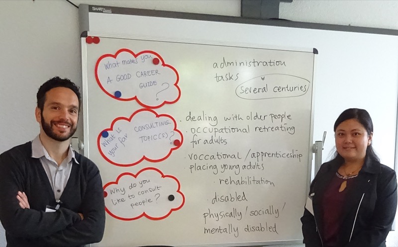 Unter der fachkundigen Anleitung der Englischtrainer Yuliana Preuß und Den Antonakas übten sich die Teilnehmer in der Beschreibung von Biographien und Beratungsthemen, wobei auch der Unterschied zwischen formalem und einfachem Englisch verdeutlicht wurde. Anhand verschiedener Berufsbilder wurden gemeinsam Kompetenzprofile entwickelt und die entsprechende Terminologie gesammelt. Auch wurden passende und leicht verständliche englische Begriffe und Formulierungen für die tägliche Arbeit zusammengestellt, auf typische Übersetzungsfehler und veraltete Begriffe hingewiesen und auf diese Weise das erlernte Schulenglisch aufgefrischt.