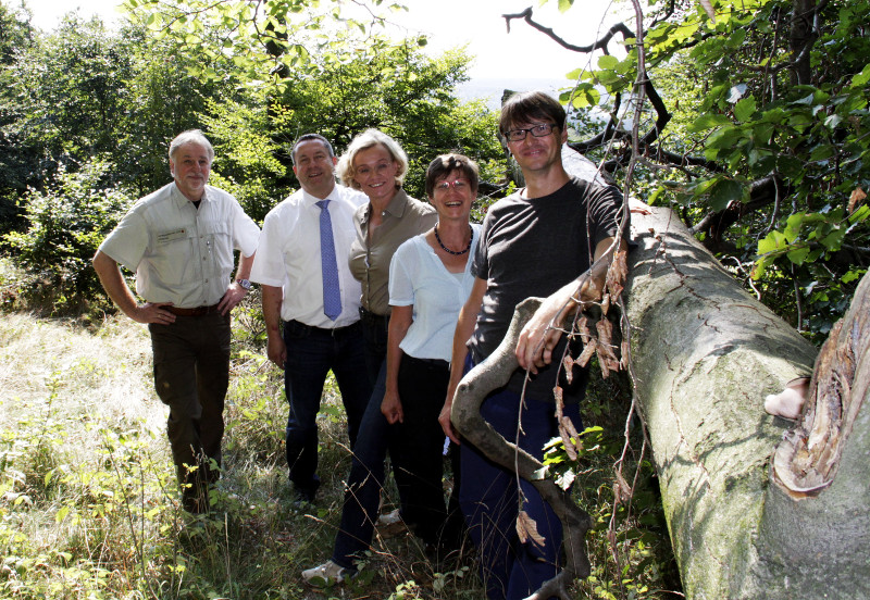 Freuen sich über ihren gemeinsamen Beitrag für den Erfolg des Naturschutzgroßprojektes Senne und Teutoburger Wald (v.r.): Projektleiter Daniel Lühr und Geschäftsführerin Birgit Hübner vom Naturpark Teutoburger Wald/Eggegebirge, Verbandsvorsteherin Anke Peithmann, Landrat Dr. Axel Lehmann und Hans-Ulrich Braun, Leiter