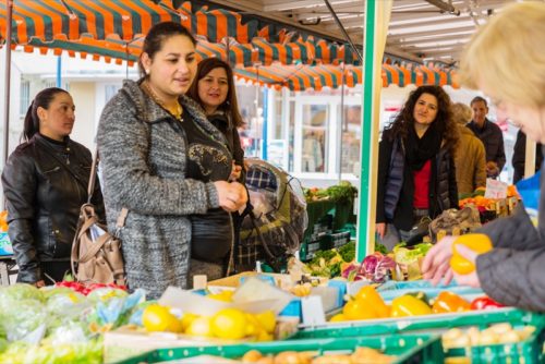 Gemeinsam auf dem Wochenmarkt: Mütter der Elterngruppe mit Nadezhda Yuliyanova Harizanova (zweite von rechts) und Nesrin Bartel (rechts).