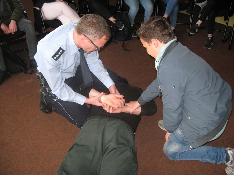 Im Anschluss ging es zur Einsatzleitstelle und in das polizeiliche Gewahrsam, wo nach einhelliger Meinung keines der Kids übernachten wollte. Nachdem Polizeihund „Leon“ sein Können unter Beweis gestellt hatte, durften die jungen Gäste selbst eine Geschwindigkeitsmessung im Detmolder Stadtgebiet durchführen. Abschließend erfuhren sie, über welche Einsatzmittel die Polizei verfügt, wie diese eingesetzt werden können und was es bedeutet, im Team polizeiliche Maßnahmen durchzusetzen. Das angehängte Foto zeigt die Kids bei einer simulierten Festnahme eines „Täters“.