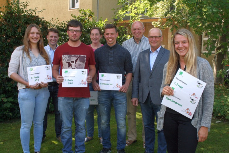 Die Gewinner und Gewinnerinnen des Fotowettbewerbs: Carina Nölker (Platz 2, von der Grothaus-Nölker-GbR in Rödinghausen – Kreis Herford), Lehrer Henning Harre, Benjamin Röttges (Platz 3, aus Schlangen – Kreis Lippe),Sarah Höcker (Sonderpreis, aus Versmold- Kreis Gütersloh), Jannik Köster (Sonderpreis, aus Ostercappeln – Landkreis Osnabrück), Lehrer Hinrich Drangmeister, Bezirksverbandsvorsitzender Hubertus Beringmeier und Daniela Koch – Platz 1 und Sonderpreis aus Salzkotten