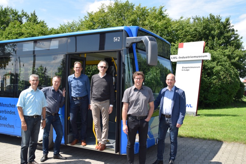 Gemeinsam für den Stadtverkehr Lage: (v.l.) Thorsten Paulussen, Technischer Beigeordneter der Stadt Lage; Willi Kulke, Museumsleitung LWL-Industriemuseum Ziegelei Lage; Uwe Friedrichsmeier, Stadt Lage; Will Wellhausen, Busunternehmer Stadt Lage; Achim Oberwöhrmeier, Geschäftsführung KVG Lippe mbH und Christian Gaier, Teilnetzmanagement BVO Busverkehr Ostwestfalen GmbH