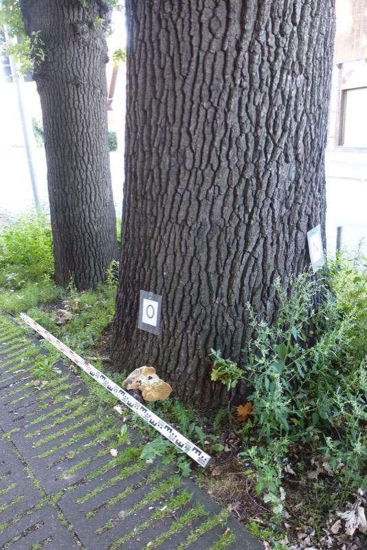 Unmittelbar vor dem Landhotel Diele an der Bielefelder Straße steht ein Baumensemble, bestehend aus zwei Stieleichen. Ein aufmerksamer Detmolder Bürger bemerkte an der größeren der beiden Eichen am Fuß des Baumes einen Pilz. Bei eingehender Untersuchung stellte sich heraus, dass es sich dabei um einen Fruchtkörper des Tropfenden Schillerporlings handelt. Der Tropfende Schillerporling kommt insbesondere an Eichen vor und zersetzt aggressiv das Wurzelholz des befallenen Baumes. Dabei zersetzt der Pilz im Wurzelholz ausschließlich das Holz, das den Baum standfest macht. Die fortschreitende Zersetzung durch den Tropfenden Schillerporling erweicht das Holz, was zum Umstürzen des Baumes führen kann.