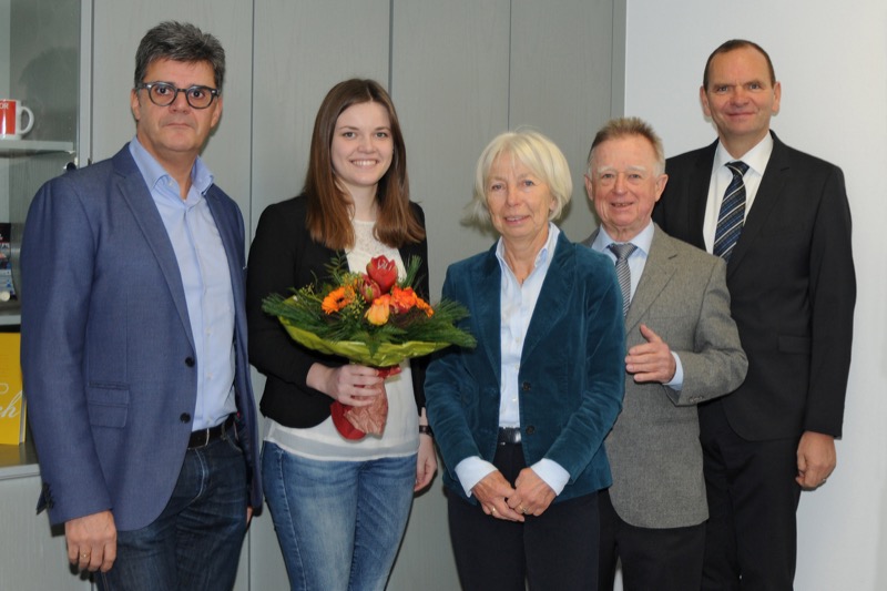 Gesa Wolf erhält für ihr Studium das Stipendium „OWL³ – Die besten Köpfe für die Region“. Die ersten Gratulanten waren die Stifter Sybille und Hannes Frank, Hochschulpräsident Professor Jürgen Krahl (r.) sowie Professor Reinhard Grell (l.), Dekan des Fachbereiches Produktion und Wirtschaft.