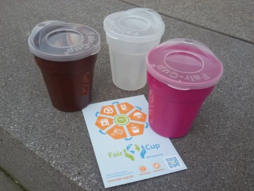 Der Fair-Cup wurde in Göttingen entwickelt, wo er bereits in über 200 Betrieben im Einsatz ist. Die Vorteile des Bechers liegen klar auf der Hand: Der wiederverwendbare Becher eignet sich für Heiß- und Kaltgetränke, ist aus spülmaschinenfestem Kunststoff, kann ca. 500 Mal benutzt werden und kann zudem auch recycelt werden. Pro Becher fallen 1,50 € Pfand an (1 € für den Becher und 0,50 € für den Deckel), der bei Abgabe erstattet wird. Selbstverständlich kann der Becher auch in einem anderen Fair-Cup- Partnerbetrieb abgegeben werden.