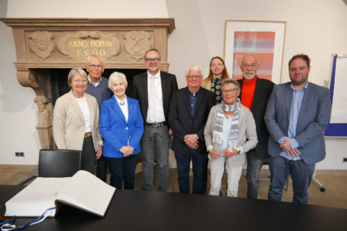 Bärbel Paciorkiewicz (3. von links) trug sich in das Goldene Buch der Stadt ein. Ebenfalls dabei waren (von links) Annegret (geb. Rossmann) und Ernst-August Kracht, Bürgermeister Markus Baier, der ehemalige Leiter der Lemgoer Museen Jürgen Scheffler, Geschäftsbereichsleiterin Lysann Rehberg, Ulrike (geb. Rossmann) und Joachim Moll sowie Museumsleiter Fabian Schröder. (Foto: Alte Hansestadt Lemgo)
