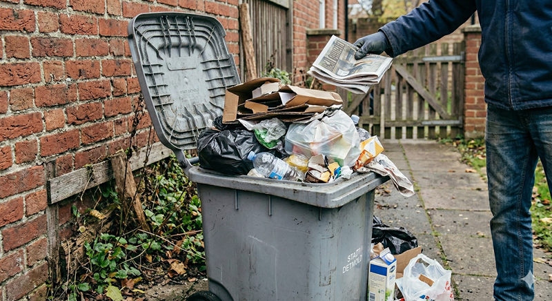 So sollte man es nicht machen: Eine offene Mülltonne wie auf diesem Symbolfoto zieht Schädlinge wie Ratten an. Dicht schließende Abfallbehälter, abgedeckte Regentonnen und sorgfältig verschlossene Spalten tragen dazu bei, einen Befall zu verhindern.         Foto: KI-generiert